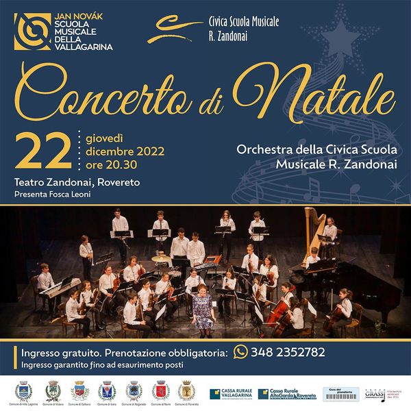 Giovedì 22 dicembre, dalle 20:30, saremo al Teatro Zandonai, per un concerto condiviso della Scuola Musicale Novák e della nostra Civica Scuola Musicale "R. Zandonai". Interverremo con la nostra Orchestra diretta dal prof. Cotogno, con un programma che include musiche di Bach e Vivaldi (con studenti solisti), Mozart, Ciaikowski, Grieg. E Strauss per il più tradizionale brindisi augurale.