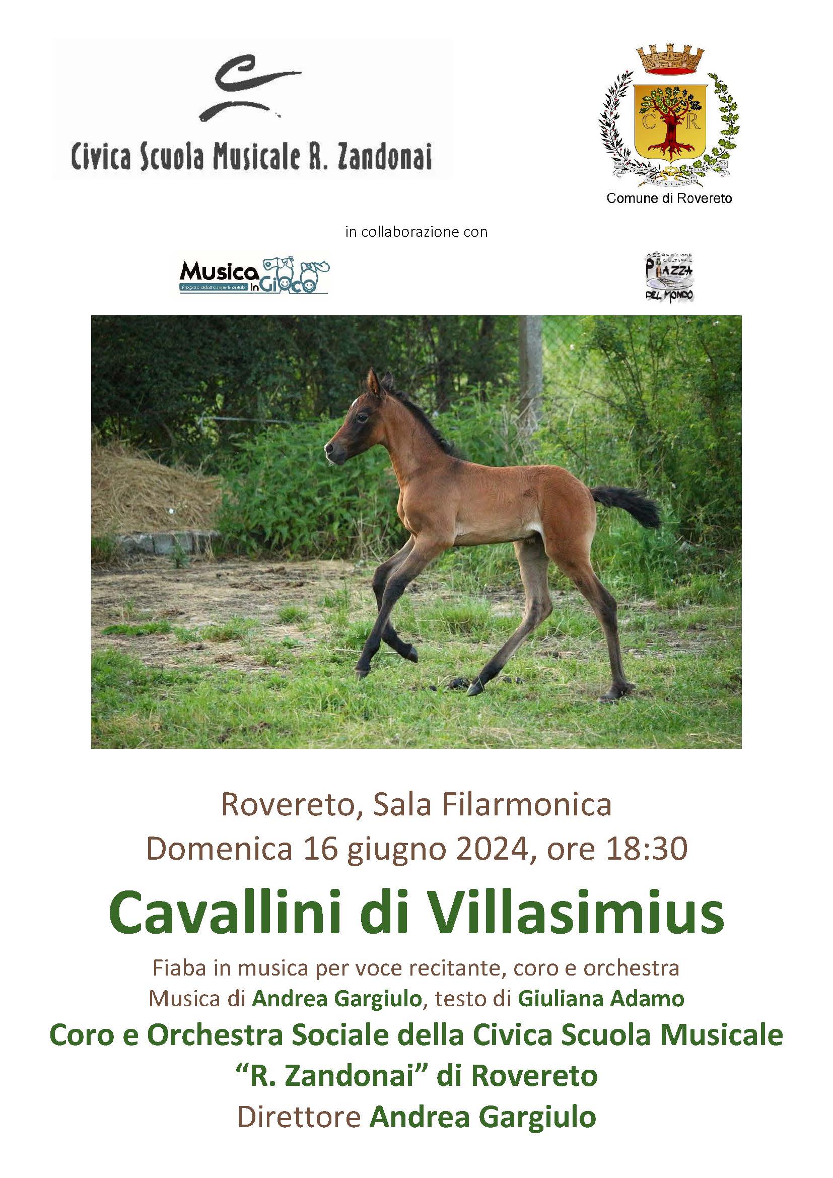 Domenica 16 giugno alle 18:30 alla Sala Filarmonica di Rovereto, concerto conclusivo, con la fiaba musicale "Cavallini di Villasimius" del Laboratorio di Orchestra Sociale della Civica Scuola Musicale "R. Zandonai" di Rovereto tenuto da Andrea Gargiulo con la collaborazione dei docenti della Scuola Musicale.